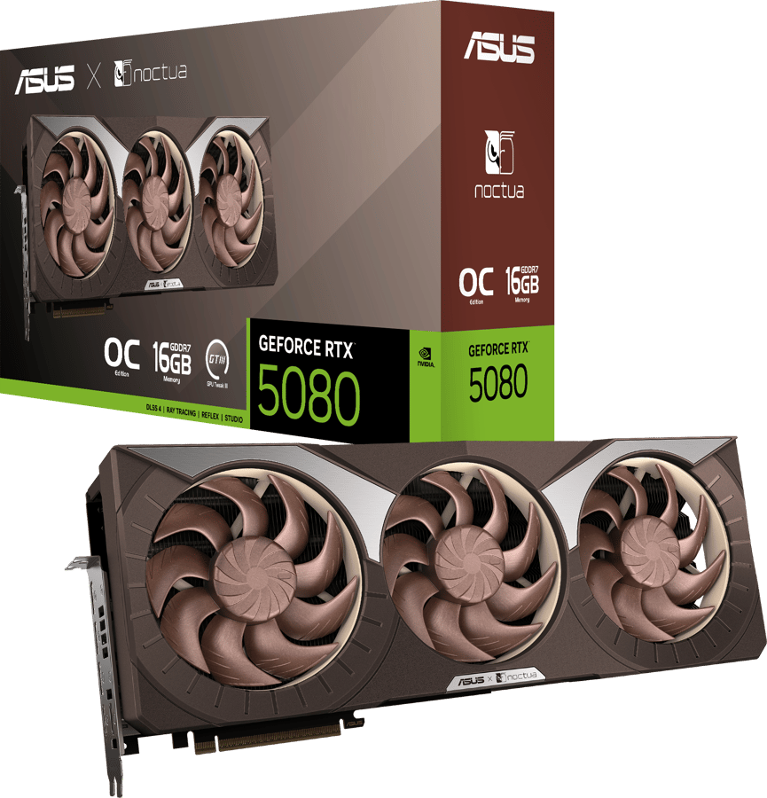 Primed for Power Experience Primal performance with the Prime GeForce RTX 5080, an SFF-ready graphics card featuring a 2.5-slot design for expansive compatibility, enhanced by a triple-fan setup for supreme airflow and vapor chamber design for supreme cooling. Powered by the NVIDIA Blackwell architecture and DLSS 4 SFF-Ready Enthusiast GeForce Card Axial-tech fans feature a smaller fan hub that facilitates longer blades and a barrier ring that increases downward air pressure Vapor chamber ensures efficient heat transfer for lower GPU temps Phase-change GPU thermal pad helps ensure optimal heat transfer, lowering GPU temperatures for enhanced performance and reliability 2.5-slot design allows for greater build compatibility while maintaining cooling performance Dual-ball fan bearings last up to twice as long as standard sleeve bearings 0dB technology lets you enjoy light gaming in relative silence Dual BIOS switch lets you toggle between Quiet and Performance BIOS profiles Auto-Extreme manufacturing process for precision and reliability GPU Tweak III software provides intuitive performance tweaking, advanced thermal control and system monitoring NVIDIA Blackwell Architecture The Ultimate Platform for Gamers and Creators Fifth-Gen Tensor Cores Max AI performance with FP4 and DLSS 4 New Streaming Multiprocessors Optimized for neural shaders Fourth-Gen Ray Tracing Cores Built for Mega Geometry AI-Enhanced Graphics and Performance NVIDIA DLSS 4 with Multi Frame Generation Game-Winning Responsiveness NVIDIA Reflex 2 with Frame Warp True-to-Life Graphics Full ray tracing with neural rendering Digital Humans and AI Assistants NVIDIA ACE Accelerate Your Creativity NVIDIA Studio creator tools and technology Enhance Any Video with AI NVIDIA Broadcast and ninth-gen NVIDIA Encoder Performance and Reliability NVIDIA app with Game Ready and Studio Drivers and Studio Drivers The Ultimate Gaming Display Technologies NVIDIA G-SYNC Build Small. Play Big. You can pack high performance into a smaller footprint with this SFF-Ready Enthusiast GeForce card. Look for cases that are compatible with SFF-Ready Enthusiast GeForce Cards to get a sure fit and streamline your PC build. Cooling 2.5-slot Design The Prime GeForce RTX 5080 features a 2.5 slot design with a carefully arranged layout for the shroud, heatsink and heat pipes to let the three Axial-tech fans leverage chassis side-panel ventilation and deliver optimal thermal performance. Axial-tech Upgrades Three tried-and-true Axial-tech fans feature a smaller hub that facilitates longer blades and a barrier ring to increase downward air pressure for lower temperatures, less noise and higher performance. Vapor Chamber A vapor chamber and heatsink soaks up heat from the graphics card, helping to ensure premium performance in a variety of scenarios. MaxContact Design MaxContact is a special ASUS manufacturing process that effectively expands the surface area of the heat spreader that sits atop the GPU by 5%, compared to traditional designs. This improves temperatures by up to 2°C, in concert with an extensive heatsink array and powerful Axial-tech fans. Phase-Change GPU Thermal Pad By melting to effectively fill the gaps between the GPU and the thermal module, a premium phase-change GPU thermal pad provides superior thermal conductivity and enhanced heat dissipation, ensuring optimal performance and longevity for graphics cards under heavy loads. 0dB Technology All three fans come to a standstill when GPU temperatures are below 50 Celsius, letting you play less demanding games or perform light tasks in relative silence. Fans start up again when temperatures are over 55 C, establishing a speed curve that balances performance and acoustics for work or play. Vented Backplate Large backplate vents significantly enhance heat dissipation, helping to keep the GPU cooler during intense tasks. This additional airflow helps ensure optimal temperatures, boosting performance, longevity and stability by defending against overheating and thermal throttling. ASUS GPU Guard & Bracket ASUS GPU Guard applies adhesive to secure all four corners to reduce the risk of cracks, while a GPU bracket helps ensure uniform mounting pressure and extra stability. Protective Backplate The PCB is reinforced by a backplate that adds structural rigidity, helping to prevent flex and to protect components and trace pathways from damage. Stainless Steel Bracket The mounting bracket features grade 304 stainless steel, chosen for its strength and high resistance to corrosion. Dual BIOS Do you prioritize low core temps or low noise levels? Performance mode lets the fans spin up to keep the card running cool all the time, and Quiet mode keeps the same power target and top-end settings while offering a less aggressive fan curve for quieter operation at moderate temperatures. Auto−Extreme Technology An automated manufacturing process that sets new standards in the industry by allowing all soldering to be completed in a single pass. This reduces thermal strain on components and avoids the use of harsh cleaning chemicals, resulting in less environmental impact, lower manufacturing power consumption and a more reliable product overall. Perfect PSU for the GeForce RTX 50 Series Patented "GPU-First" Intelligent Voltage Stabilizer Pair with the ROG Strix Platinum Series PSU and enjoy reliable power for your graphics card. GPU-First enhances voltage stability by up to 45%, even during demanding gaming sessions and overclocking scenarios, helping to ensure peak performance for a more consistent gaming experience. Additionally, the integration of a GaN MOSFET boosts power efficiency by up to 30%. Ultimate GPU Tuning Utility ASUS GPU Tweak III is more intuitive and feature-rich than ever before. A revamped interface offers greater accessibility by integrating core functions into a centralized dashboard, and the Voltage-Frequency tuner has been overhauled to make overclocking even easier. Additional goodies like