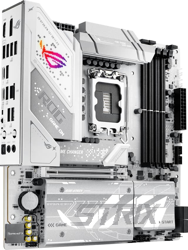 ASUS ROG STRIX B860-G GAMING WIFI moderkort, med LGA 1851-sockel, stöder DDR5-minne upp till 192GB vid 9066MHz, har WiFi 7, PCIe 5.0, Thunderbolt 4 och 7.1-ljud, vilket ger hög spelprestanda i en microATX-form.