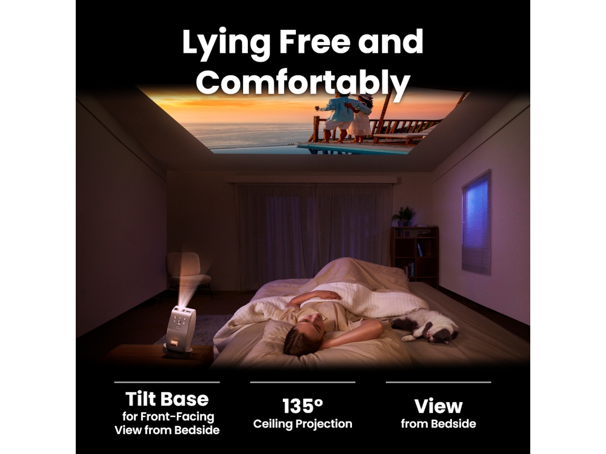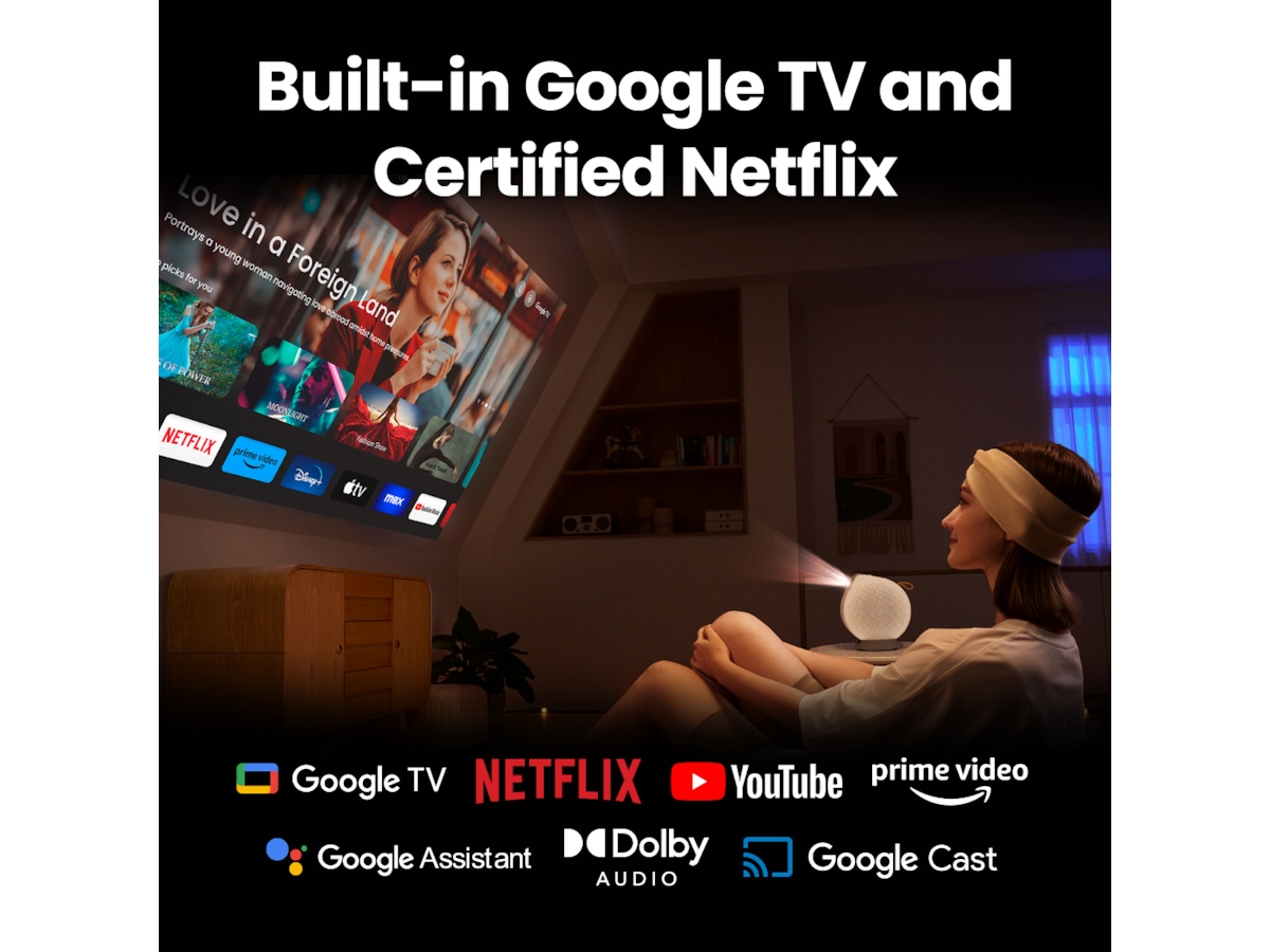 BenQ GV50 bärbar laserprojektor Upplev den ultimata komforten med GV50. Perfekt för avslappnade filmkvällar, dess flexibla basdesign möjliggör sömlös takprojektion direkt från din säng. Njut av kvadratiska bilder utan ansträngning med autofokus, 2D keystone-korrigering. Med inbyggd Google TV, Netflix och stöd för AirPlay och Chromecast är det ditt uppgraderade underhållningsnav. Dessutom garanteras levande bilder med dess laserljuskälla som levererar 500 ANSI Lumen och 98 % Rec.709 brett färgomfång. Och glöm inte den rika 2.1-kanaliga ljudupplevelsen, tack vare dess 270-graders 18W Bluetooth-högtalarsystem. Gå iväg för att sova GV50 är perfekt för läggdagsfilmer, vilket ger en avslappnad tittarupplevelse Ögonvårdsläge Justerar automatiskt bildskärmsfärger för minskad ansträngning på ögonen, vilket främjar naturlig sömn. Ljud vid din säng Speciell ljuddesign för att rikta ljudet nedåt för att matcha din sängs höjd för ljudnedsänkning. Ändra storlek med lätthet Justera skärmstorleken för att säkerställa optimal visning utan takhinder Växla till din komfort Flytta skärmen vertikalt och horisontellt och hitta den optimala visningen utan ansträngning. Koppla av i och position Rotera bilden med en 16-stegs skärmgrad för bekväm visning från valfri liggande position Helt ny underhållning GV50 inbyggd med ny Google TV och certifierad Netflix för oändlig streaming. Ljusare, levande bilder GV50 1080p Full HD-projektor med 500-lumen laser med hög ljusstyrka och HDR10 Uppslukande ljud med bas GV50 inbyggd bluetooth-högtalare med bas Håll dig uppkopplad och mobil GV50 ger oöverträffad bekvämlighet och mångsidighet för din underhållning, både inomhus och utomhus. Enkel installation Stöder displayutgång och strömförsörjning från USB C. Autofokus, auto 2d keystone och undvikande av hinder 100" på 2,7m avstånd. Visa mer Visa mindre