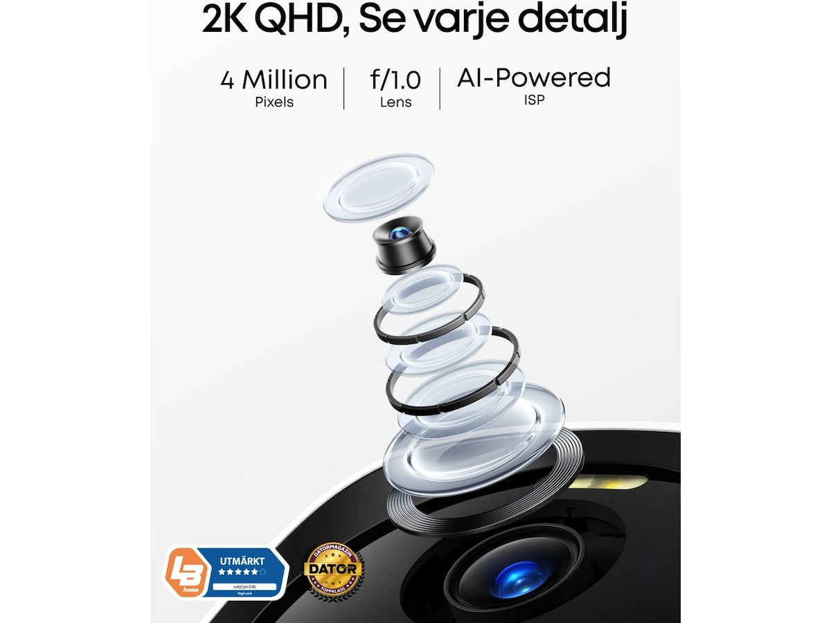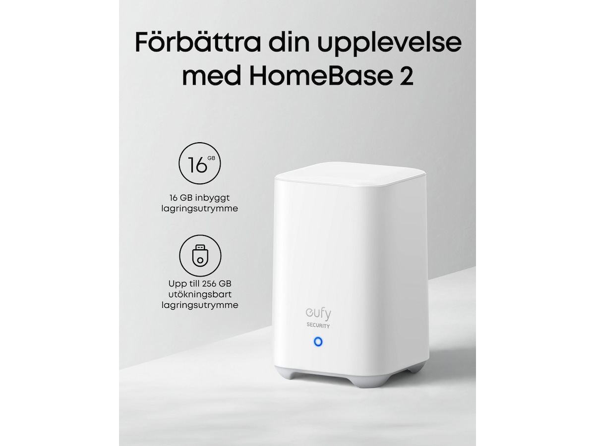 Anker EufyCam E40 EufyCam E40 2-Cam Kit med HomeBase kombinerar avancerad övervakningsteknik, smart energihantering och integritetsskydd i ett komplett säkerhetssystem för ditt hem. Med två 2K-kameror, solcellsladdning, tvåvägsljud och lokal videolagring får du en tillförlitlig och abonnemangsfri lösning* för övervakning av t.ex. trädgård, garage eller uppfart. Valfria- och premiumtjänster kan komma att bli tillgängliga med prenumeration. Skarpa färgbilder i 2K-upplösning Kamerorna levererar kristallklar 2K-upplösning med MaxColour Vision, vilket ger färgvideo även i mycket svagt ljus. Du ser detaljer som kläder, ansikten och registreringsskyltar dygnet runt. Solcellsdrift med lång batteritid EufyCam E40 har ett inbyggt 13 000 mAh-batteri och använder SolarPlus 2.0-teknik som ger effektiv laddning – även under molniga dagar eller i delvis skuggade lägen. Kamerorna har en inbyggd solpanel, men kan även kopplas till en extern solpanel för ännu bättre solfångst. Smart rörelsedetektering och tvåvägskommunikation Den förbättrade PIR-sensorn känner pålitligt av rörelser och startar inspelning när det behövs. Med tvåvägsljud kan du prata med besökare eller skrämma bort objudna gäster – tydligt och utan störande bakgrundsljud. Trygg lagring – inga avgifter Alla inspelningar sparas lokalt i HomeBase 2 med 16 GB inbyggt lagringsutrymme. Du slipper löpande kostnader och har full kontroll över dina data. Valfria molntjänster finns att lägga till om så önskas. Anpassad för ditt smarta hem Systemet stöder Apple HomeKit, Amazon Alexa och Google Assistant för enkel röststyrning och integrering med andra smarta enheter. Med IP66-klassning är kamerorna tåliga nog för att skydda ditt hem året runt – oavsett väder. Visa mer Visa mindre