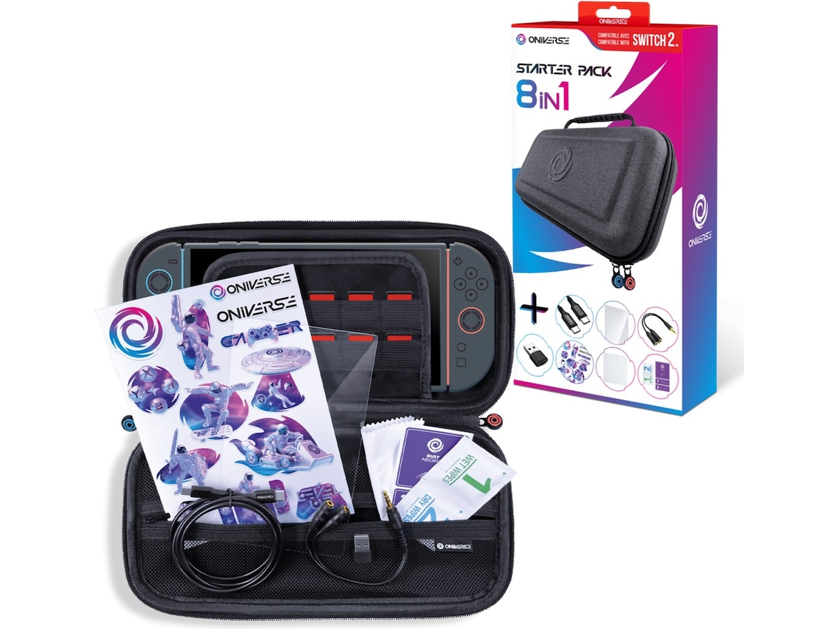 Oniverse Nintendo Switch 2 8-i-1 Startpaket Upplev heltäckande skydd och ökad bekvämlighet med detta 8-i-1 startpaket, utformat för att stödja din Nintendo Switch™. Det robusta fodralet ger pålitligt skydd mot stötar och fall, vilket gör det perfekt för spelare på språng. Det 0,33 mm tjocka skärmskyddet av 9H härdat glas ger klart skydd mot repor och slag, och bevarar en smidig och uppslukande spelupplevelse. Dela ditt spelande med en vän med hjälp av den dubbla ljudutgångssplittern, och ladda effektivt var du än är med USB-C® till USB-C®-kabeln. Håll din konsol i toppskick med det medföljande rengöringskitet och mikrofiberduken, och ge din enhet en personlig touch med det anpassade klistermärkesarket. Skärmskydd tillverkat av 9H härdat glas, 0,33 mm tjockt Fodral med nätficka och plats för 10 spel 1,5 meter USB-C® till USB-C®-kabel med hållbara aluminiumkontakter Ljudsplitter som stödjer två hörlurar samtidigt USB-C till USB-A-adapter för utökad kompatibilitet 10x10 cm Oniverse mikrofiberduk Rengöringskit med 2 våtservetter Anpassat Oniverse-klistermärkesark Visa mer Visa mindre