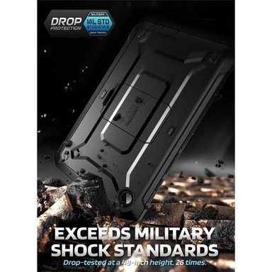 SUPCASE Unicorn Beetle Pro skal till Samsung Galaxy Tab A11 Supcase Unicorn Beetle Pro surfplatteskal är konstruerad för att möta de högsta standarderna och ger din surfplatta det bästa skyddet. Med en stötabsorberande baksida av polykarbonat och med kanter av TPU och en framsida av polykarbonat så erbjuder detta surfplatteskal ett skydd av militärklass mot repor, stötar och fall. Supcase har vunnit CNET:s första pris genom olika tester med att släppa skalet från olika höjder utan att gå sönder. Supcase har även erhållit det amerikanska militärcertifikatet MIL-STD 810G-516.6. Surfplatteskalet har ett integrerat ställ som kan fällas ut vid behov. Integrerat skärmskydd håller surfplattans skärm skyddad från smuts och repor. Specifikationer Material: TPU/PC Kompatibilitet: Samsung Galaxy Tab A11 Innehåll 1x surfplatteskal (surfplatta ingår ej)