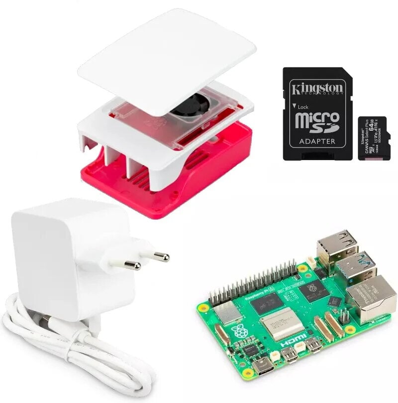 Ett komplett startpaket baserat på Raspberry Pi 5. Paketet innehåller: 1st Raspberry Pi 5 16GB, 1st Kingston 64GB minneskort, 1st Raspberry Pi 5 Red/White Case, samt 1st Raspberry Pi 5 Power Supply (USB-C, Vit). Observera: Kittet inkluderar inte en Micro-HDMI adapter, detta säljes separat.