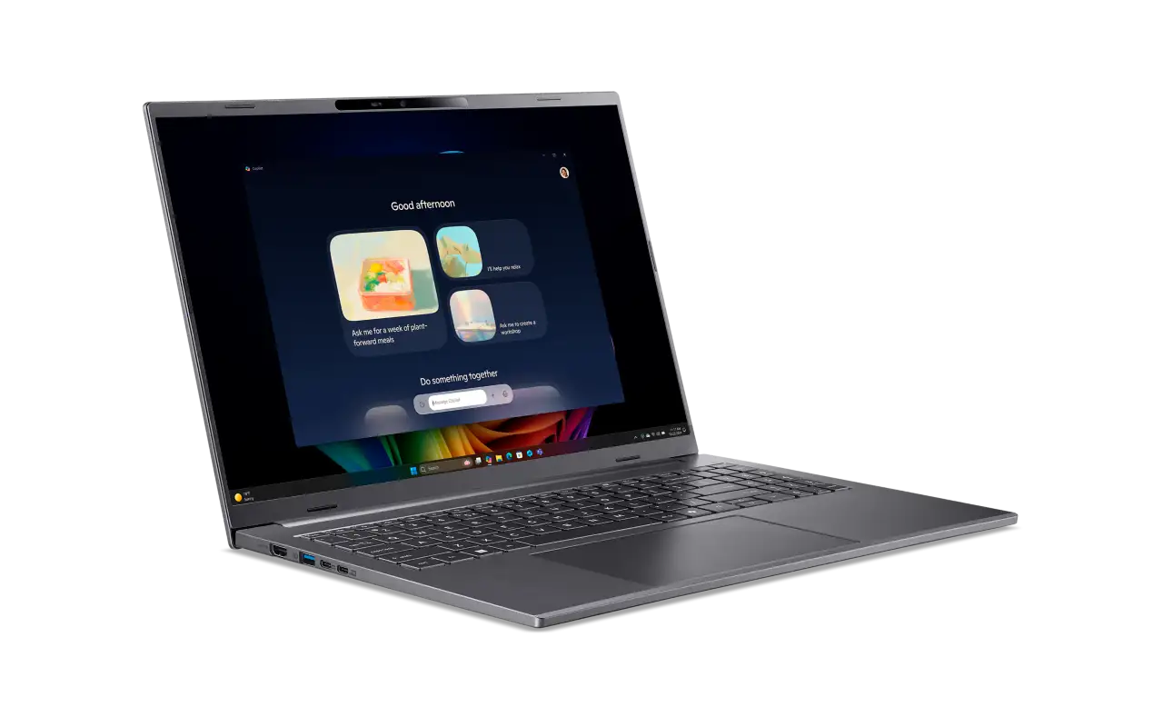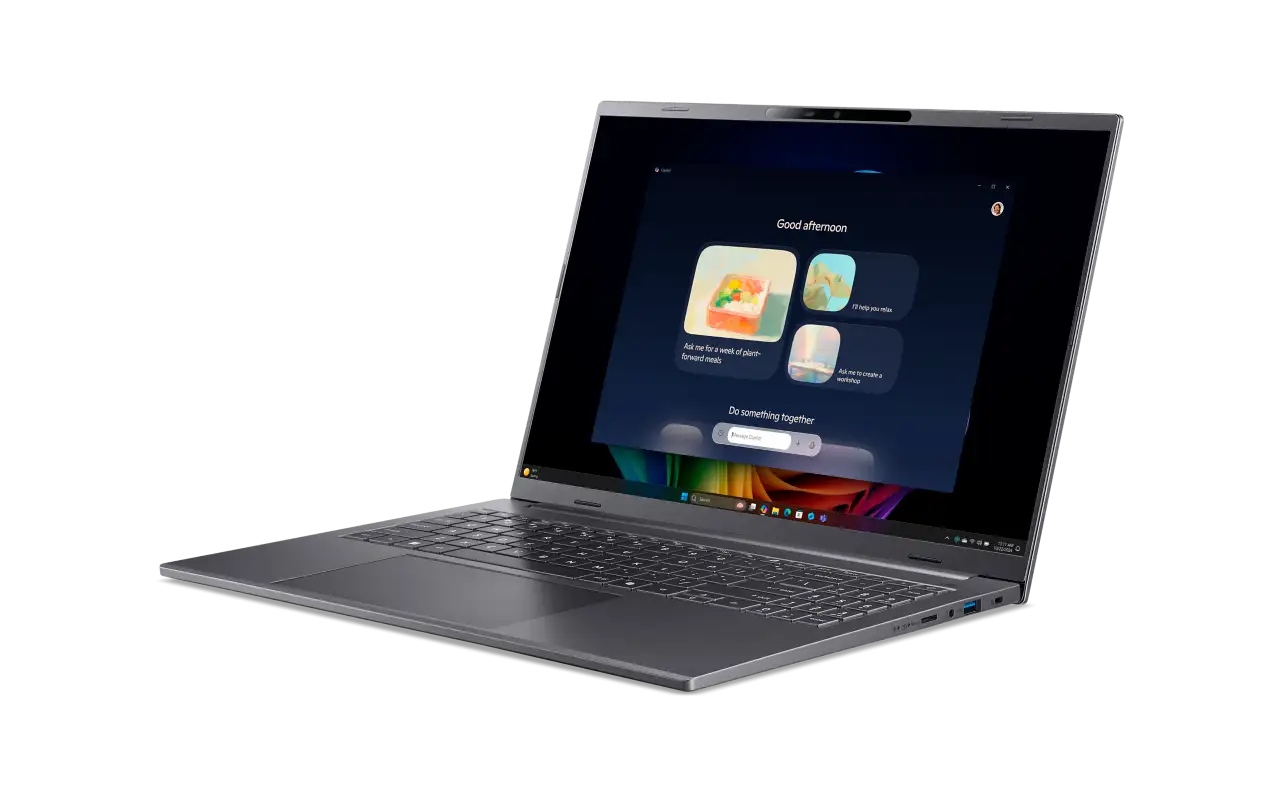 Aspire 16 AI Utforska. Utvecklas. Aspirera. AMD Ryzen™ AI 7 350 AMD Radeon™ 860M integrerat grafikkort 1024 GB PCIe NVMe-lagring och 32 GB LPDDR5X RAM 16-tums WUXGA OLED-skärm med 120 Hz uppdateringsfrekvens, DCI-P3 100 % och True Black 500 CoPilot+ PC med Wi-Fi 6E för blixtsnabba AI-funktioner Den ultimata prestandaförbättringen Ta dig an intensiva arbetsuppgifter och multitaska som aldrig förr med superladdad AI-prestanda, blixtsnabb respons och ett batteri som räcker i flera dagar – drivet av AMD Ryzen™ 7 AI 350-processor, 1024 GB SSD-lagring och 32 GB LPDDR5X-minne. Stil och substans Aspire 16 AI har ett tåligt, tunt och lätt aluminiumchassi i ultramodern design. Ett gångjärn som kan öppnas 180° ger smidig flexibilitet och gör det enkelt att arbeta, studera eller vara kreativ – var du än befinner dig. En fröjd för ögat Njut av extra klara och strålande bilder med 16-tums WUXGA OLED. Smala ramar och ett 16:10-format ger gott om skärmyta, medan DisplayHDR™ True Black 500 levererar djup kontrast, rika svärtor och levande ljusstyrka för en riktigt uppslukande OLED-upplevelse. Början på en ny AI-era Copilot+ PC är mer än bara smart programvara – den blir en förlängning av ditt arbetsflöde, förutser dina vanor, möter dina behov och ger intelligenta förslag så att du kan fokusera på det som verkligen betyder något. Smart och smidig AI Intelligenta Acer AI-lösningar finns alltid nära till hands. Få svar utan ansträngning, strömlinjeforma inställningar, optimera din närvaro i videosamtal och ta kommunikationen till nästa nivå. Upplev intuitiv AI som är enkel att använda och sömlöst förbättrar din produktivitet. Utvecklad med omtanke Aspire 16 AI är byggd med smarta funktioner för mångsidighet i vardagen och levererar praktisk bekvämlighet, inklusive två USB4™ 4-portar, ett integrerat kameraskydd och Bluetooth 5.3 – allt i ett paket av 100 % återvinningsbara material och med EPEAT Gold-certifiering.