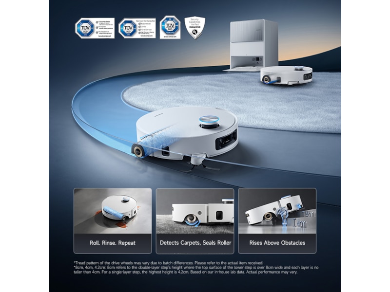 Dreame Aqua10 Ultra Roller Aqua10 Ultra Roller kombinerar kraftig dammsugning med effektiv moppning i ett helt autonomt system. Den levererar upp till 30 000 Pa sugeffekt och har en roterande mopprulle som rengör sig själv under användning, för dammfria, blanka golv i ett svep. Allt underhåll – från tömning av damm och smutsigt vatten till påfyllning av rent vatten och noggrann tvätt av mopprullen – hanteras automatiskt i den integrerade allt-i-ett-dockan. Med uppgraderad AI-navigering rör sig Aqua10 Ultra Roller smidigt genom möblerade rum, identifierar hinder som sladdar, mattor och husdjursplatser, och anpassar sig till olika underlag. Den hanterar höjdskillnader upp till 8 cm (dubbeltrösklar på 4 cm + 4 cm), klarar sig under möbler ner till 98 mm, och är konstruerad för riktiga hem med barn, husdjur och höga hygienkrav. 30 000 Pa sugeffekt för skinande rena golv Mopprulle som rengör sig själv under drift Kan klättra över dubbeltrösklar upp till 8 cm Identifierar 240 objekt med AI-navigering Torkar moppen hygieniskt med 70 °C varmluft Innovativ moprulle för hygienisk rengöring I stället för traditionella moppdukar som innebär att robotdammsugaren ofta måste återvända till dockningsstationen för tvätt, använder Aqua10 Ultra Roller en ny, rund AquaRoll™-borste som roterar samtidigt som den rör sig framåt och kontinuerligt får friskt vatten vid varje svep. Med ett innovativt vattenkontrollsystem utrustat med 12-dyssprayteknologi justeras vattenflödet för moppningen med hög precision, så att rullen hålls konstant fuktig. Under rotationen suger en högtryckspump effektivt upp det smutsiga vattnet, som leds till en separat tank för använt vatten. Detta gör det möjligt för rullen att rengöra sig själv kontinuerligt under användning och förbli fräsch längre. Rullen skrubbar golvet och tar bort alla fläckar med intelligent tryckkontroll på 9–11 N, vilket garanterar en djupgående rengöringseffekt. Den drivs av en högvarvsmotor och roterar 100 gånger per minut, vilket möjliggör grundlig och intensiv rengöring. För att skydda mattor mot fukt är rullen utrustad med ett automatiskt AutoSeal™-sköldsystem, bestående av en barriär som täcker rullen när en matta registreras, så att mattorna förblir torra och luktfria. Bakom rullen roterar FluffRoll™-modulen i motsatt riktning för att lösgöra fibrerna och göra moppen luftigare. Själva borsten är uppbyggd av täta fiberlager, och när dessa lyfts och "fluffas upp", får moppen bättre förmåga att tränga djupare ner i ytan och leverera ett mer optimalt rengöringsresultat. Precis och säker navigering i hela hemmet Den uppdaterade AstroVision™-navigeringen, driven av NVIDIA, gör att Aqua10 kan identifiera över 240 objekt inom alla hushållskategorier. Två AI-kameror kartlägger rummet och föremålen i det i 3D, så att roboten manövrerar precist även i komplexa rumslayouter. För att förhindra fastkörning och säkerställa fri navigering i krävande miljöer är enheten utrustad med ProLeap™-systemet. Detta består av utdragbara ben som lyfter chassit, vilket gör att den kan korsa nivåskillnader på upp till 4,2 cm i ett steg eller dubbla steg på 4 cm + 4 cm, vilket motsvarar totalt 8 cm. Ett inbyggt stötdämpningssystem hindrar hårda kollisioner och minskar ljudnivån, vilket ger tyst och effektiv drift. Vid möbler med låg frigång, som soffor och sängar, drar roboten automatiskt tillbaka LDS-sensorn i chassit för att minska höjden. Navigeringen tas över av de två AI-kamerorna, som med hjälp av RGB-teknik genererar en 3D-bild av omgivningarna. När roboten befinner sig i öppnare områden höjs sensorn igen, vilket ger snabb och precis navigering. Detaljerad rengöring längs väggar och i hörn Aqua10 Ultra Roller är utrustad med flera system för att nå helt in i hörn och längs väggar. Den automatiska sidoborsten fälls ut vid behov och rengör längs kanter, möbelben och trånga ytor. Efter användning höjs den 10 mm för att undvika att sprida smuts över rena ytor. Med MopExtend™-teknologi förlängs rullen upp till 40 mm så att den når djupare in i hörn och längs väggar än traditionella system. I appen kan användaren anpassa mattinställningar: Robotens chassi, huvudborste, sidoborste och moppvals kan höjas i en koordinerad rörelse för att passera mattor utan att fastna eller fukta dem. Specifika mattor kan också markeras som områden som ska undvikas helt, såsom yogamattor eller mattor med fransar. Allt-i-ett-docka för komplett underhåll Efter varje rengöringscykel återvänder roboten till sin allt-i-ett-docka där all underhåll hanteras automatiskt. Här töms damm och smutsigt vatten, medan rent vatten fylls på. För att hålla rullen hygienisk rengörs den med 100 °C varmt vatten genom ThermoHub™-systemet, vilket effektivt löser upp fett, smuts och bakterier. Temperaturen sänks därefter automatiskt för säkerhet i hem med barn och husdjur. Moppen torkas sedan med 70 °C varmluft kombinerat med 60 °C värmeelement, medan den roterar 360 grader. Resultatet är en torr och fluffig mopp utan restfukt. Samtidigt torkas dammpåsen med 50 °C luft, och fuktighet tas bort via en intern ångström för att hindra lukt och bakterier. Allt sker tyst (37 dB). Två separata behållare för rengöringsmedel gör det möjligt att använda både ett standardmedel och ett specialmedel mot husdjurdoft, baserat på naturliga ingredienser – båda doseras automatiskt. Överlägsen sugekraft och hårhantering utan trassel Aqua10 Ultra Roller kombinerar imponerande sugekraft på upp till 30 000 Pa med ett smart borstsystem designat för att hantera hår, damm och större partiklar utan att trassla. Kärnan är HyperStream™ Detangling DuoBrush, bestående av två borstar: en av flexibel TPU-gummi och en med mjuka nylonborstar. Tillsammans lyfter de effektivt smuts och hår, och leder det direkt in i dammbehållar