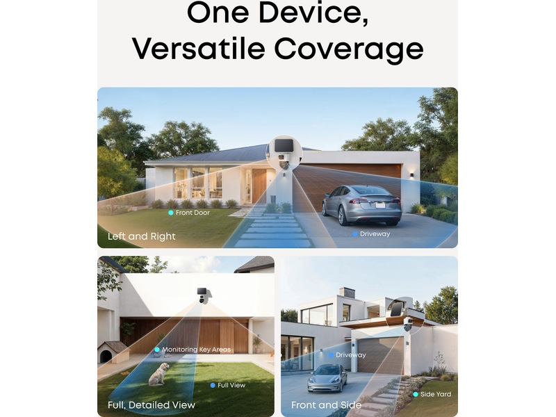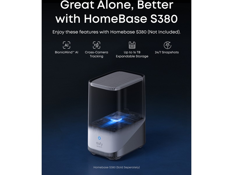 Eufy eufyCam S4 Solo övervakningskamera Revolutionerande trippellins Bullet-PTZ-kamera En allt-i-ett-enhet som ersätter och överträffar separata bullet- och PTZ-kameror. Det övre 4K bullet-objektivet ger en fast vidvinkel på 130°, medan det nedre 2K dubbellins-PTZ ger 360° smart spårning och zoom. Bullet-till-PTZ-spårning och autoframing När bullet-kameran upptäcker ett objekt låser PTZ-kameran omedelbart, spårar och zoomar in för att fånga detaljer upp till 50 meter bort. När flera objekt kommer in i bilden zoomar kameran automatiskt ut för att hålla alla synliga. Kraftfull solcellsladdning med SolarPlus Håll kameran laddad året runt med en extra stor solpanel på 5,5 W och SolarPlus 2.0. Endast en timme direkt solljus per dag håller kameran igång, och den avtagbara designen ger enkel och flexibel montering. Utmärkt på egen hand eufyCam S4 kan användas fristående – ingen HomeBase krävs. Den har inbyggd AI för smart detektion av människor, fordon och husdjur. Den levereras med 32 GB inbyggd lagring, kan utökas till 256 GB via microSD (ingår ej). Bättre med HomeBase S38 Lås upp BionicMind AI för att skilja familj från främlingar. Med 16 GB inbyggd lagring, kan utökas till 16 TB, lagras dina videor säkert. Använd den senaste eufy-appen och uppdatera HomeBase S380 till V3.7.2.8+ för att aktivera 24/7-inspelning och Snapshots. Andra HomeBases (S280/Mini/Professional) och eufy NVR stöds inte. Precis detektion, kraftfull avskräckning Radar- och PIR-sensorer ger exakta rörelsevarningar med färre falsklarm. När ett hot upptäcks inom din zon eller enligt ditt schema aktiveras röda och blå varningsljus samt en 105 dB siren för att avskräcka inkräktare. Visa mer Visa mindre
