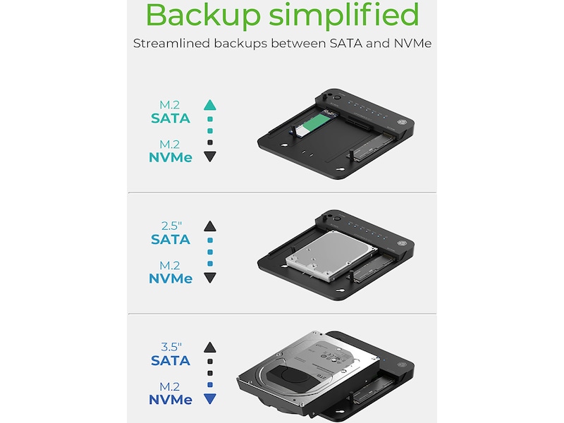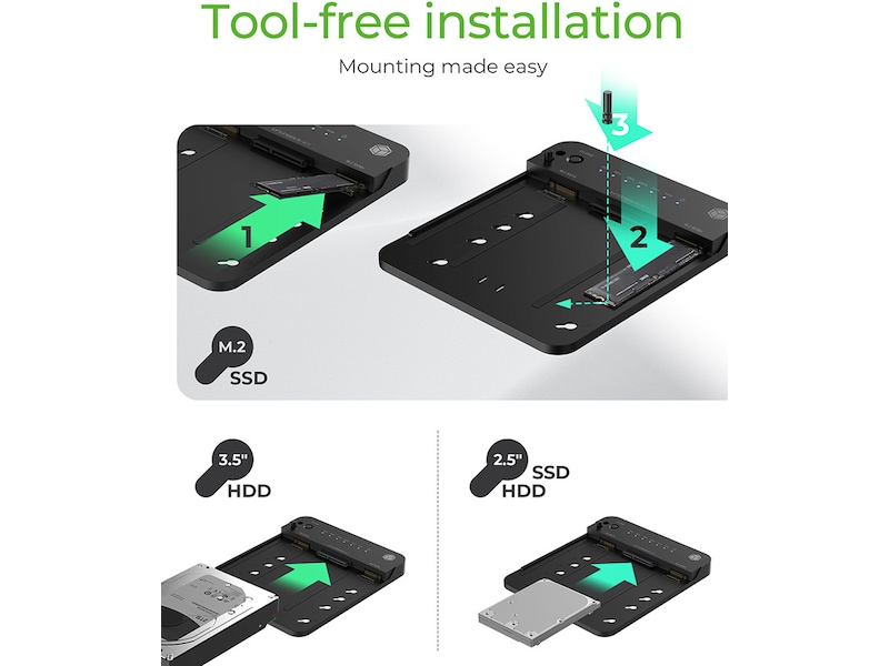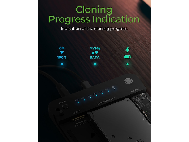 Icy Box CloneStation & Dockingstation för M.2 NVME & SATA 2.5”/3.5” SSD/HDD ENKEL MONTERING: Upplev ett nytt läge för hårddiskinstallation med vår verktygsfria design, som möjliggör snabb och enkel installation av 2,5", 3,5" HDD eller M.2 SSD-enheter. Anslut bara din enhet till den tilldelade kortplatsen och njut av den smidiga kopieringsprocessen. KLONNING UTAN PROGRAMVARA: Att säkerhetskopiera data har aldrig varit enklare: Med vår mjukvarufria kloningsteknik har processen för att skapa en säker kopia av dina data förenklats och effektiviserats. Erbjuder en mer effektiv lösning. ANSLUTNING MED TOPPHASTIGHET: Med kraften från USB 3.2 Gen 2 och den inklusive USB Type-C och Type-A-kabeln, upplev dataöverföring som inte bara är snabb utan även imponerande effektiv, med hastigheter på upp till 10 Gbit/s. PRECIS KLONNING: Dra nytta av exakt duplicering. Varje bit replikeras från källenheten till destinationen som en felfri kopia av alla data och konfigurationer av den ursprungliga enheten. Processen att duplicera data från en hållbar hårddisk till en snabb SSD, eller vice versa, kunde inte vara bekvämare. TVÅRIKTNINGSKLONNING: Klona från 2,5"/3,5" SATA HDD/SSD till M.2 PCIe NVMe SSD eller gör tvärtom, allt med en knapptryckning. Tillåter en enkel datasäkerhetskopiering eller systemaccelerationsprocess, som tillgodoser dina specifika behov. Helt enkelt klona allt SATA till PCIe NVMe eller PCIe NVMe till SATA, 2,5"/3,5" hårddiskar till M.2 eller tvärtom eller M.2 till M.2: här går precis vad som helst med allt, och otroligt enkelt! Datamedierna installeras och klonas helt utan verktyg. Kloningsriktningen väljs helt enkelt med en skjutreglage. Enkel kloning Bit för bit och byte för byte utan komplicerad programvara. Databärarna sätts helt enkelt in i respektive slot och klonas med en knapptryckning. Oavsett om det är från M.2/2.5"/3.5" SATA till M.2 NVMe eller vice versa. Dubbelriktad och tvärteknologisk kloning är nu väldigt enkelt. Flexibel anslutning Kan även användas som extern lagring i DockingStation-läge. Med den medföljande USB 3.2 Gen 2-kombinationskabeln, som är utrustad med en USB Type-C® och standard Type-A-anslutningen, kan lämplig värdanslutning alltid väljas. Datan rasar genom linjen med upp till 10 Gbit/s. Visa mer Visa mindre