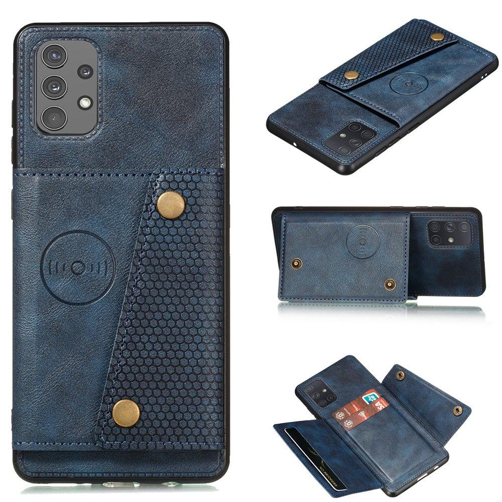 Exklusivt Skyddande Skal med kortfack på baksidan som har en praktiskt knapp förslutning. Passar: Samsung Galaxy A32 Retro Design Här har du det perfekta skalet för dig som tycker en plånbok är för klumpig att bära runt på. Det finns plats för 4 kort Din telefon sitter säkert i en mjuk ram av silikon som ger skalet mer stötabsorbering. Skalet går också att ställa upp med hjälp av att öppna kortfacket. Magnetisk baksida Enkel åtkomst till knappar och laddningsintag. Tillverkat i högkvalitets PU-Läder och Silikon Finns i Svart, Ljusbrun, Mörkblå, Röd samt Grå